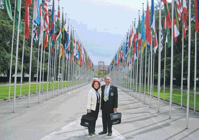 AOA President, Peter B. Ajluni, DO, poses for a snapshot with Debra A. Smith, DO, outside the United Nations’ European Headquarters in Geneva, where they attended the World Health Organization’s 61st Annual Assembly.